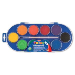 Scopri i nostri acquerelli in scatola di plastica, ideali per colori a dita e disegni. Il kit include 10 pastiglie di acquerello jumbo, un pennello e un pratico contenitore. Sono perfetti per carta per acquerello e sono ribagnabili. Prodotto in Italia con energia pulita, sicuro per bambini oltre 3 anni.