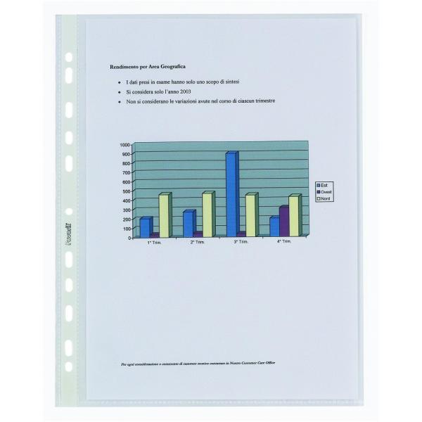 Le nostre buste trasparenti sono realizzate in polipropilene e presentano una superficie antiriflesso. Sono dotate di foratura universale, ideali per archiviazione e organizzazione di documenti. Queste buste sono perfette per uffici e studi dove è necessaria una buona visibilità dei contenuti.