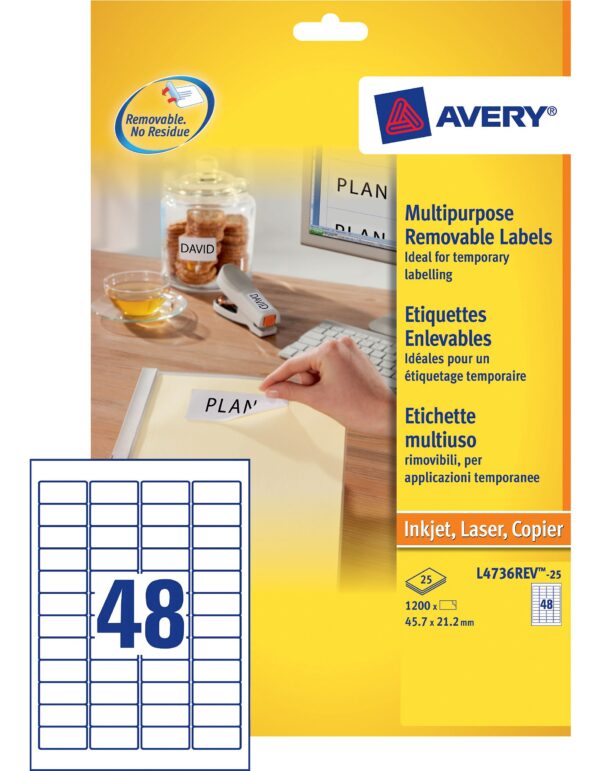 Confezione da 25 fogli nel formato a4 in carta bianca con adesivo rimovibile ogni foglio contiene 48 etichette con angoli tondi nel formato 45 7×21 2mm per stampanti inkjet laser laser a colori l 39 etichetta aderisce su diversi tipi di superfici rimovibile senza lasciare residui puo 39 essere riposizionata diverse volte su superfici quali vetro metallo e plastica ecologiche possono essere riciclate come la carta comune