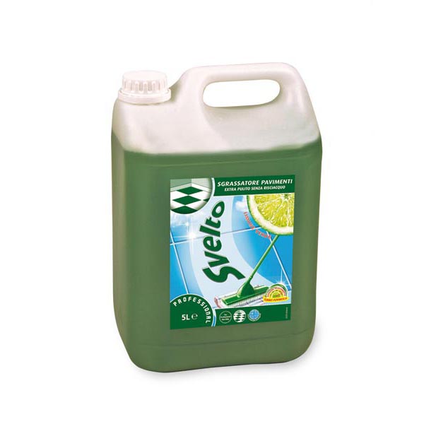 Il detergente sgrassante Svelto è un prodotto per la pulizia di pavimenti duri e superfici lavabili, disponibile in tanica da 5 litri, senza necessità di risciacquo.