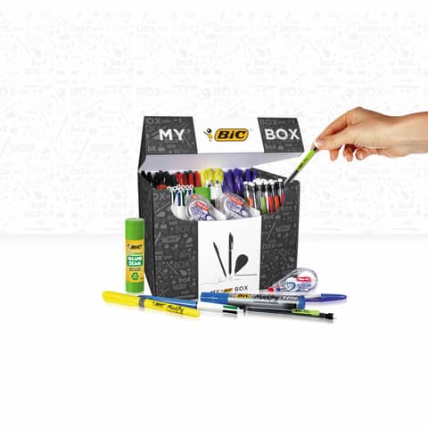 La My BIC Box è la confezione ideale di articoli di cancelleria indispensabili per tutte le tue esigenze in ufficio, a scuola o in casa. Contiene 124 articoli fra cui penne a sfera, portamine, correttori, colla ed evidenziatori. Tutti gli articoli hanno la garanzia di qualità BIC a un prezzo vantaggioso. Diversi prodotti sono in plastica riciclata (tra 51% e 100%) o hanno la certificazione ecologica NF Environment assegnata a prodotti dal basso impatto ambientale con una lunga durata di utilizzo.