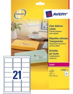 Etichetta adesiva L7560 poliestere adatta a stampanti laser permanente 63 5x38 1 mm 21 etichetta per foglio trasparente Avery conf 25 fogli A4