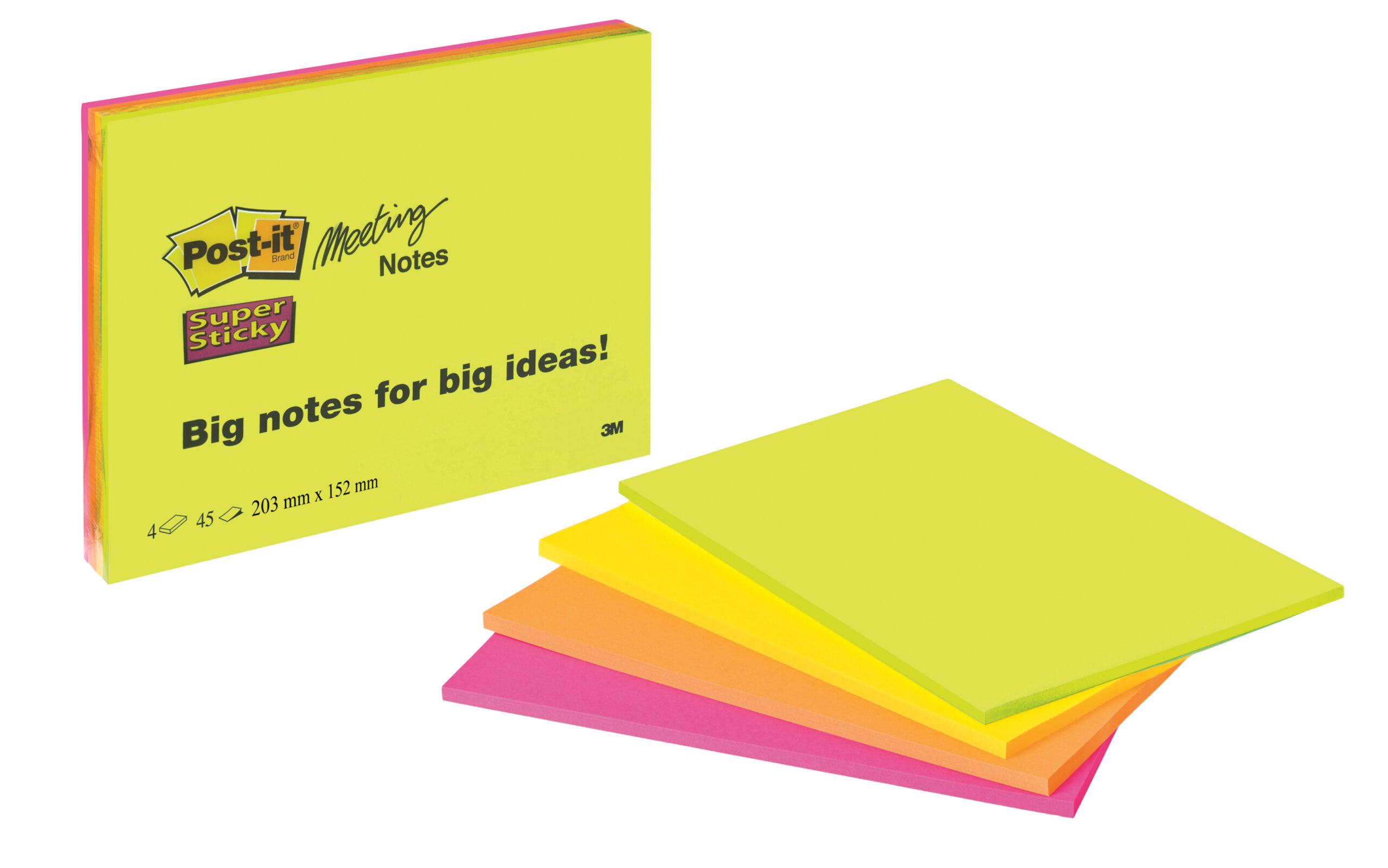 Post-it Super Sticky Meeting Notes Large, blocchi adesivi in confezione da 4, dimensioni 149x200mm, colori neon. Migliorano la produttività quotidiana grazie alla loro super adesione ovunque. I foglietti possono essere attaccati facilmente su diverse superfici per lasciare promemoria o note importanti.
