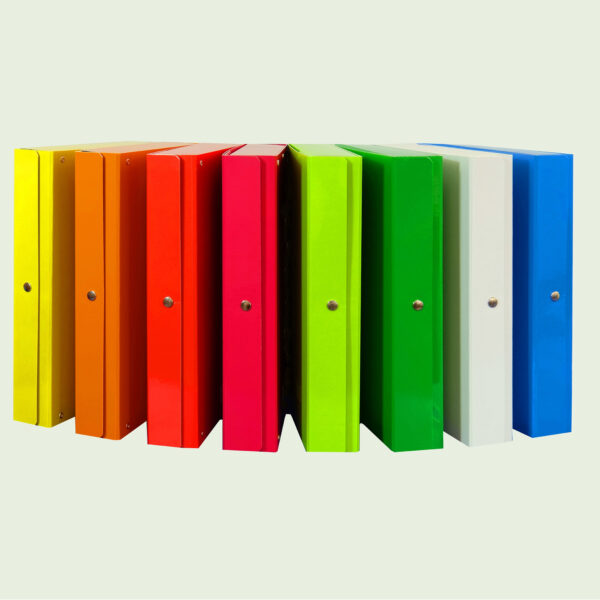 La Scatola progetto Glossy è una cartella in cartone da 1mm plastificato lucido, ideale per l''archiviazione di documenti. Ha una chiusura con 3 bottoni a pressione e un dorso di 12 cm. La finitura lucida brillante la rende elegante. Il formato utile è di 25x35cm.