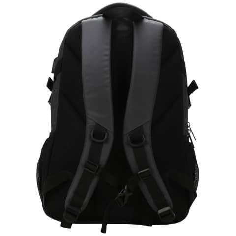 Lo zaino business per laptop realizzato in tessuto con 3 scomparti interni imbottiti e separati con cerniera grigia cucita all`interno. Scomparto principale per tablet, blocco note, cataloghi, presa USB esterna con cavo interno. Scomparto principale per notebook fino a 15,6 pollici con scomparto per laptop imbottito particolarmente morbido con passante di sicurezza per fissare il laptop. Tasca frontale organizzativa con 4 tasche a bustina di diverse dimensioni e 2 portapenne, piccola tasca con cerniera sulla parte anteriore dello zaino. Su entrambi i lati si trova una tasca laterale in rete per